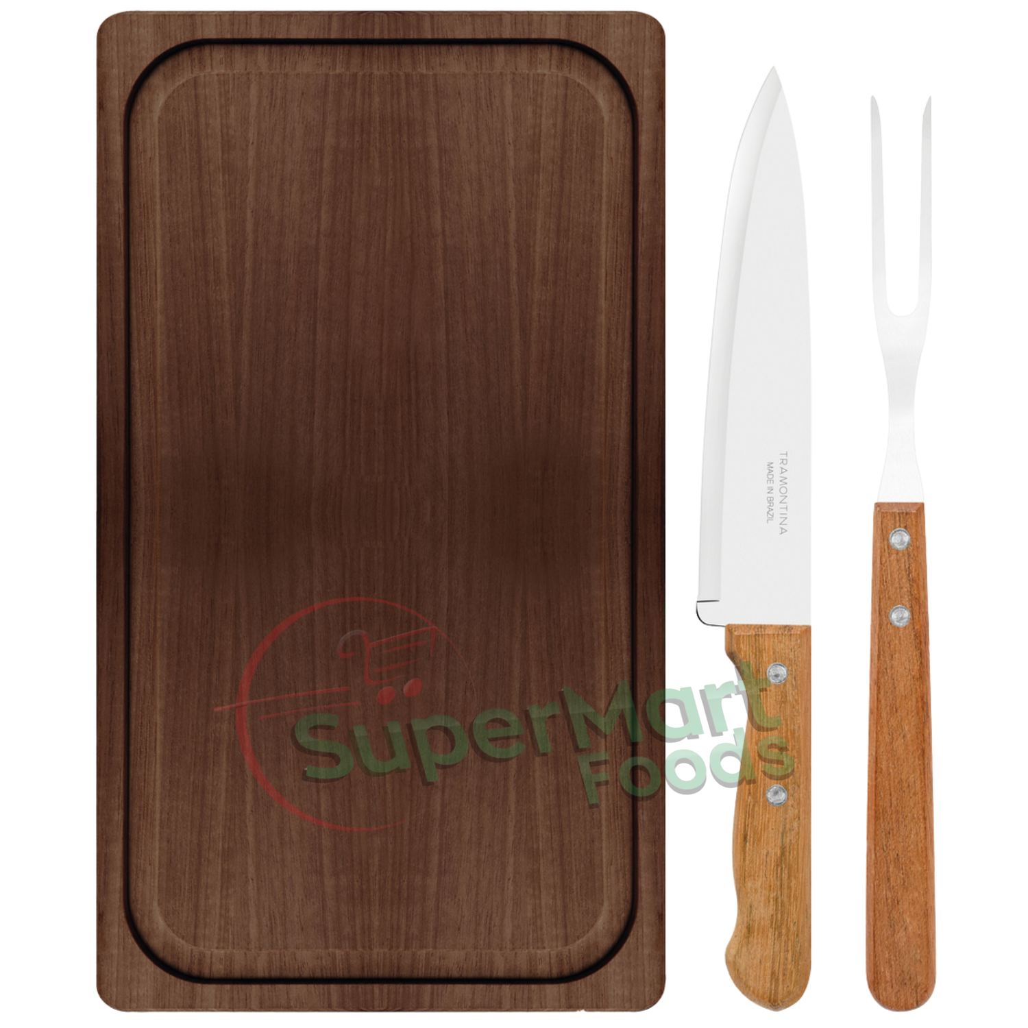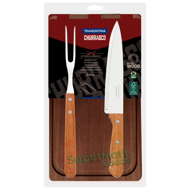 トラモンティーナ 3ピース バーベキューセット: ステンレススチールナイフ 1本 / ステンレススチールフォーク 1本 / 木製カッティングボード 1枚